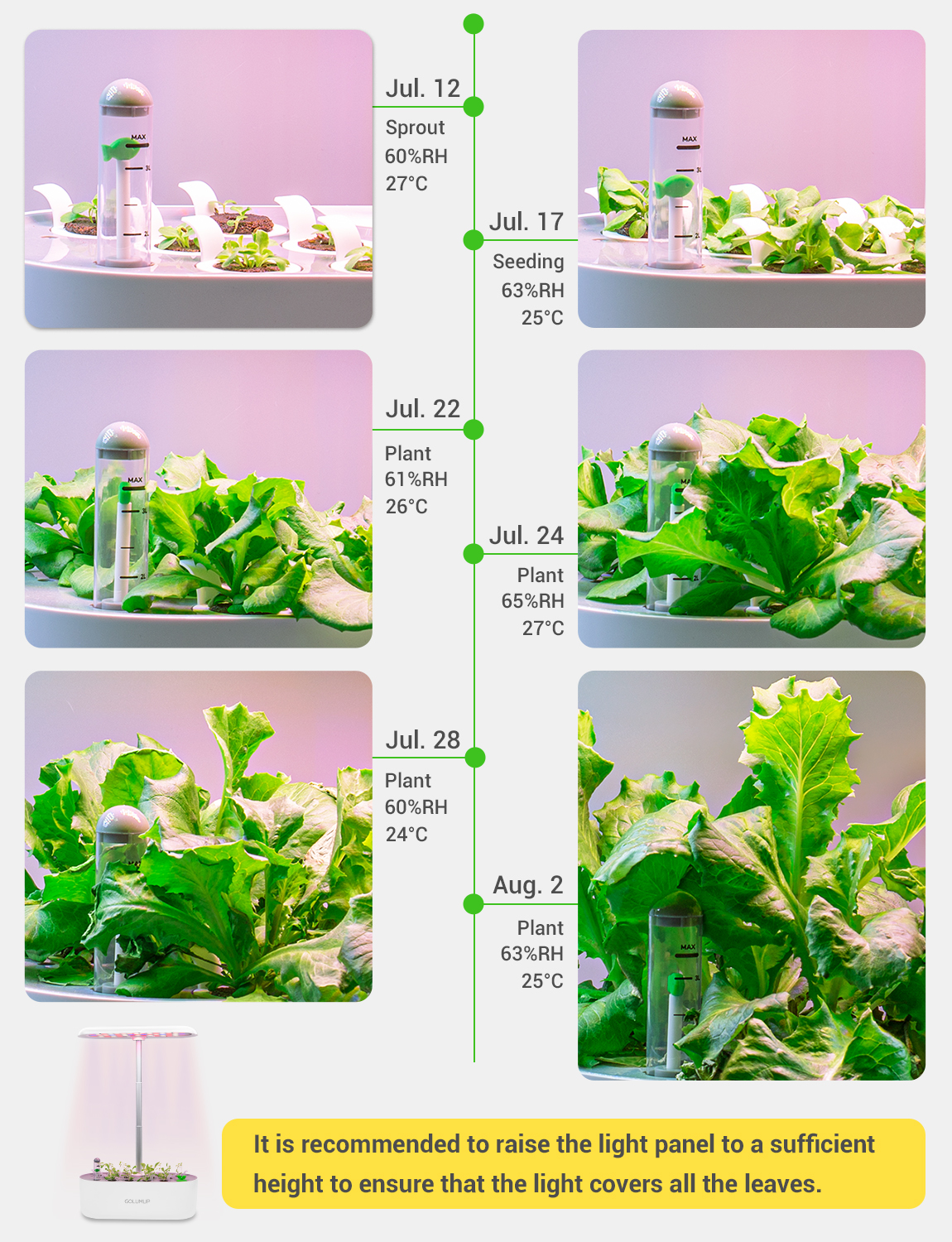 [Adjustable Grow Kit] Indoor garden kit with 4 lighting mode has different ratio of blue&red light and lighting time, corresponding to the different growth period. You can also adjust the height to fit your growing plants. (Note: Please pull up the light board when it just germinates.)