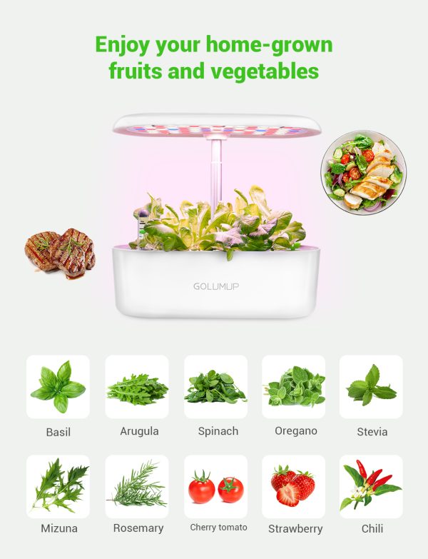 [Full Spectrum LED Lights] – GOLUMUP hydroponic growing system is equipped with 26 watt full-spectrum LED lights, which can simulate natural light and improving photosynthesis in any weather to speed up the growth. That means you can grow the plants anywhere you like indoors